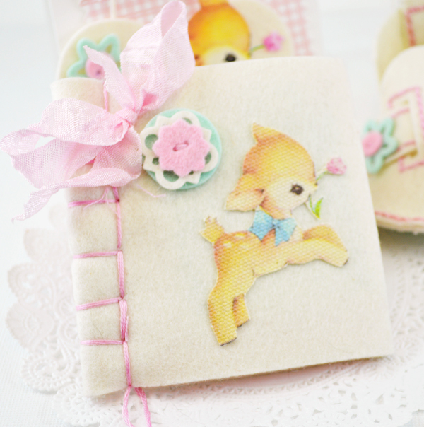 And I don’t even have a baby to give them to! (Oh, wait…maybe I do…my friend, Kirby, just became a grandpa of a little baby girl named Harper – she just might need this sweet ensemble.) Below, I’ve got instructions on how to make the little felt book, links and tips for the baby booties, and a link to the free Baby Deer image.