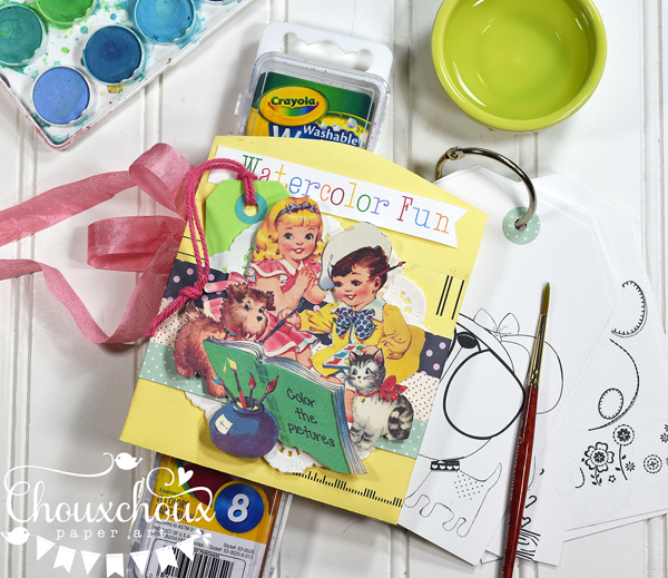 Since the watercolor craze is full on! Here’s an idea to get your kids (grandkids, friend’s kids, any kids) to join in: a watercolor tag book! And, of course, you would need a cool gift pocket for it, too. Keren, and I have teamed up to bring you this free darling vintage graphic just perfect for watercolor fun!