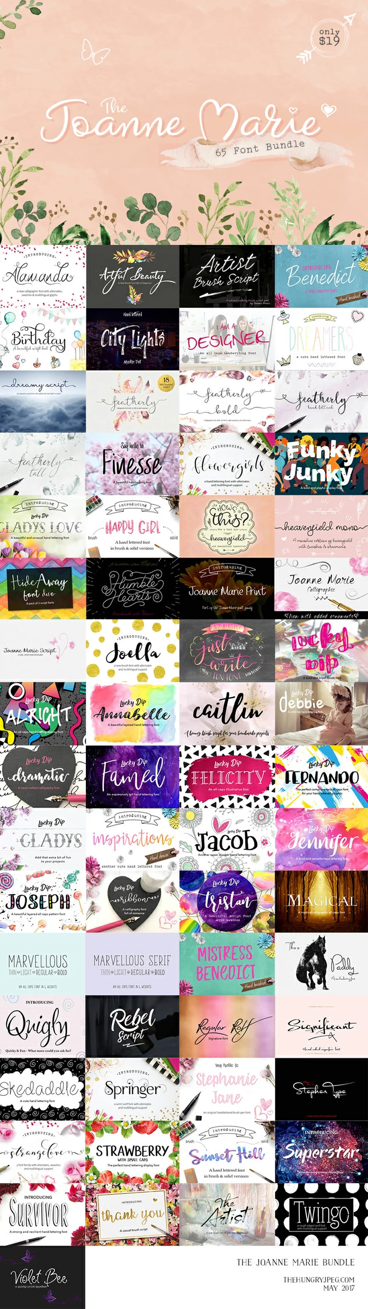 The Joanne Marie 65 Font Bundle just went live for only $19!