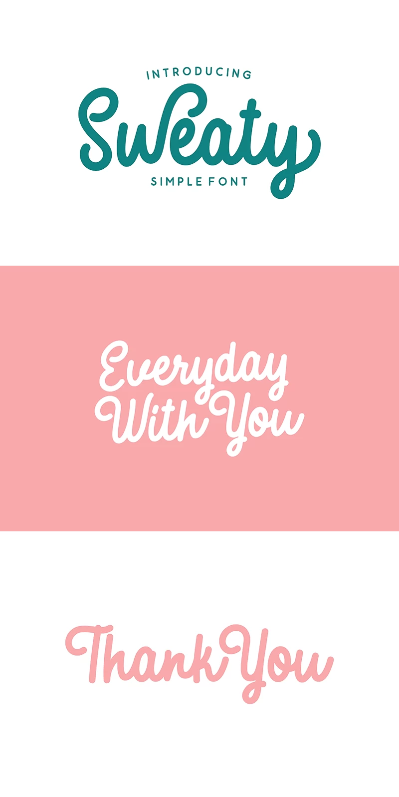 In the designer’s own words “Sweaty is a simple script typeface which is simple and funny. This font is perfect for a logo, quotes, apparel design, wedding invitation, and much more. You can use the alternate to create your own customized lettering!”