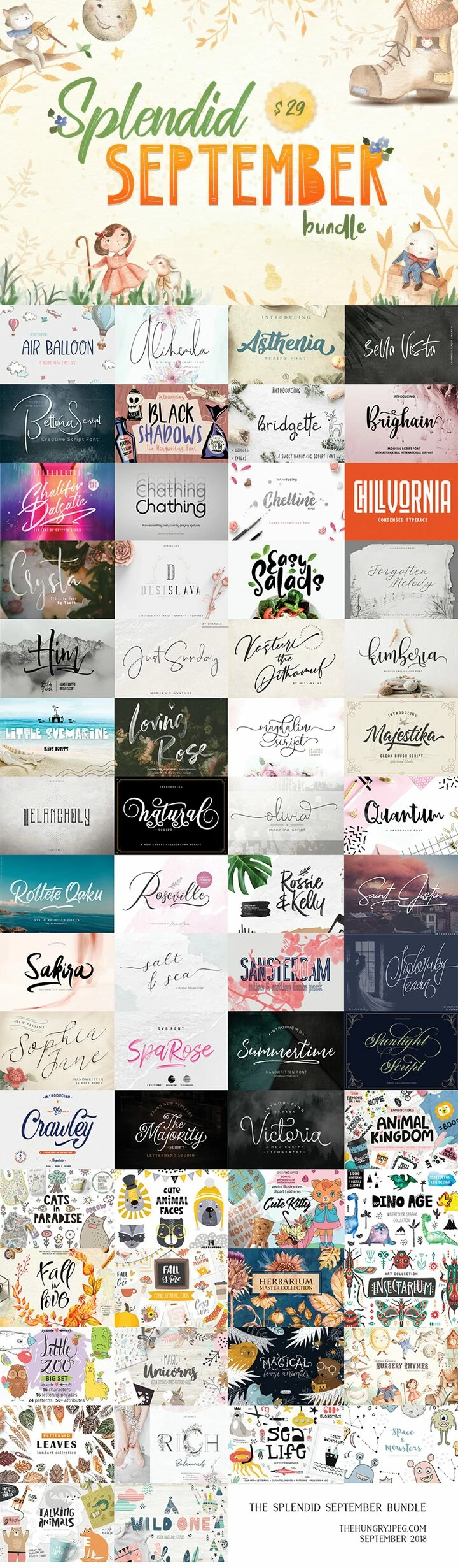Filled with Autumn Charm and incredible fonts – this collection should definitely be considered for your digital library! A huge collection of 43 high quality fonts and 19 gorgeous graphics packs (with over 2980 design elements), all for the price of one! Get this spectacular pack for ONLY $29 for a limited time only. That’s 96% OFF the regular price (worth $739)!