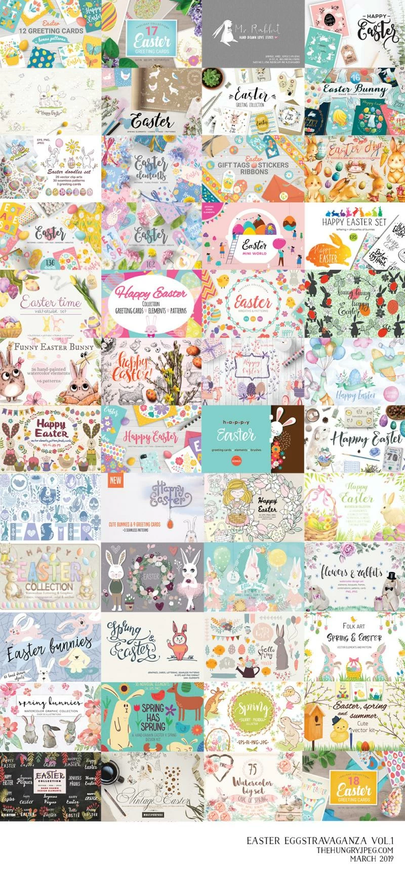 The Easter Eggstravaganza Vol. 1 includes cliparts of beautiful Easter eggs, graphics, wreaths, patterns, and letterings from 48 graphics packs is perfect for the upcoming Easter celebration. We wanted to make this bundle really good, making it a huge collection with over 1000 elements! Usually, worth $570, you can grab this whole collection for JUST $29— that’s a saving of 95%!