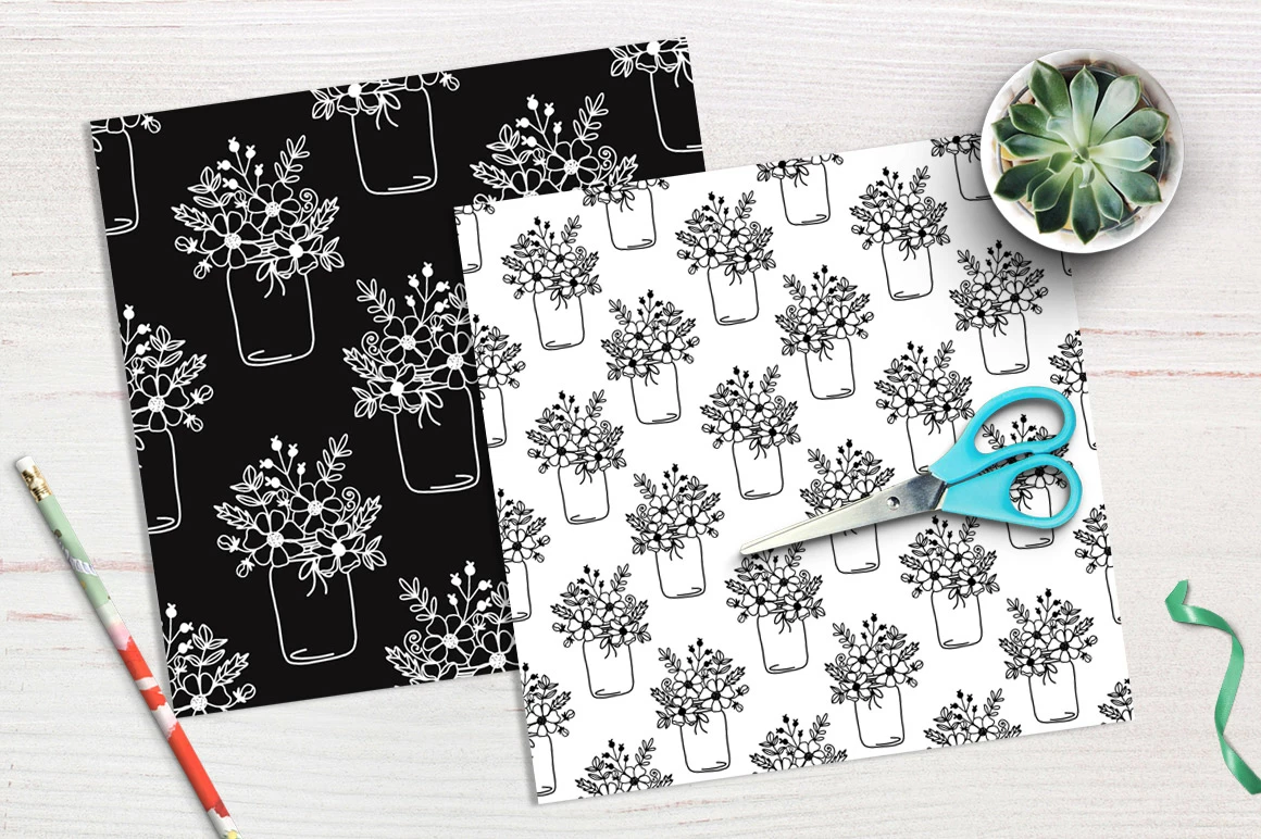 Download this Free Mason Jar Flower Paper Collection With pretty Doodle style Seamless Black and white Pattern.